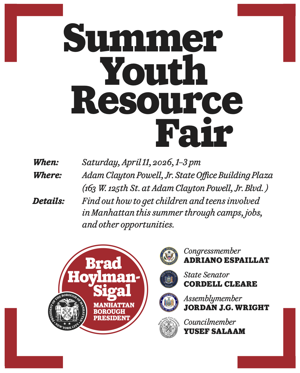 Back to All Events Summer Youth Resource Fair Saturday, April 11, 2026 1:00 PM 3:00 PM Google Calendar ICS