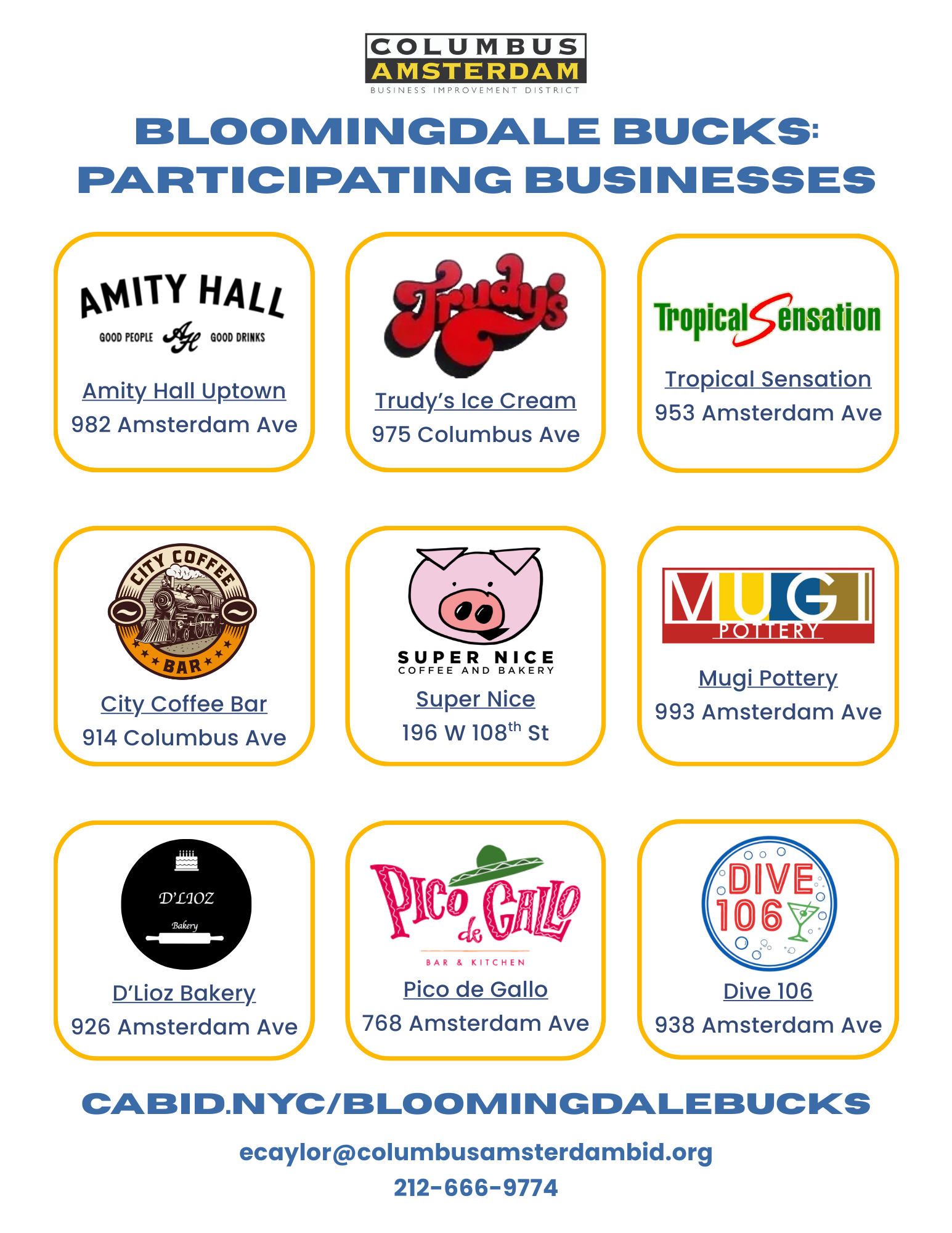 Hello neighbors! The Columbus-Amsterdam BID is running a pilot program from March 1-June 1, 2026 to test a neighborhood rewards program called Bloomingdale Bucks. If you are a frequent shopper in the Bloomingdale area, this is a great way to support our local businesses and earn rewards by patronizing the restaurants and stores you already love! Pick up a stamp cards from any participating business starting March 1 and get to shopping! We'll also have cards available to pick up from the BID office at 991 Amsterdam Ave.